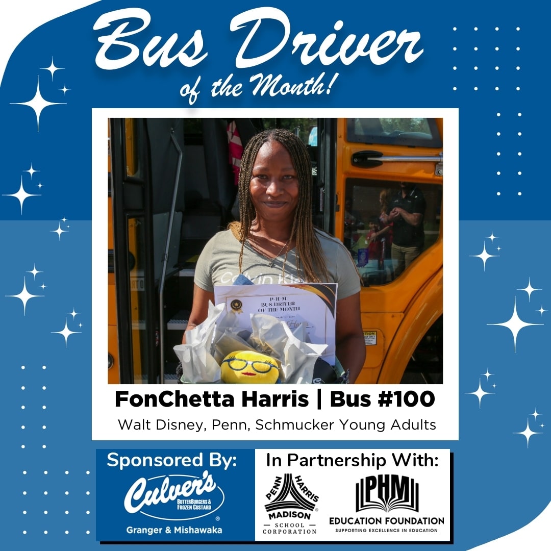 Welcome to the Penn-Harris-Madison School Corporation Bus Driver of the Month program, where excellence behind the wheel is celebrated! Sponsored by Culver’s of Granger and Mishawaka, along with the PHM Education Foundation, this initiative recognizes the dedicated individuals who ensure our students arrive safely to and from school every day.